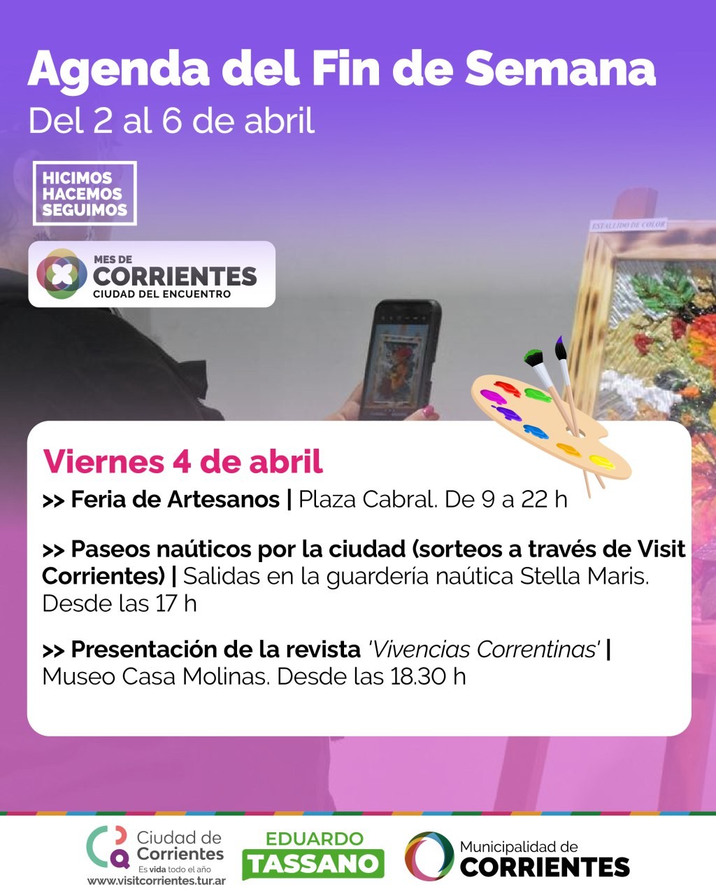 La Municipalidad preparó una atractiva programación en el marco del aniversario 437º de la fundación de la Ciudad de Corrientes. A partir de este miércoles 2 al domingo 6 de abril se desarrollarán las primeras propuestas. El jueves será la velada apertura con música y danza, y el circuito turístico “Descubrí Corrientes” suma recorridos y tendrá como invitado a Enrique Galiana.
