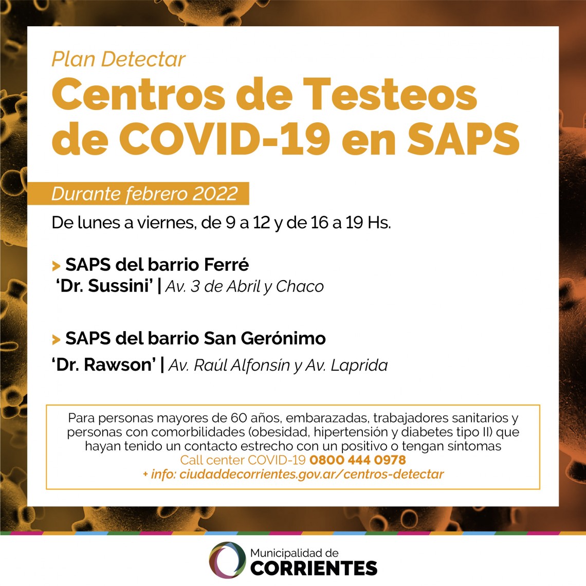 La Municipalidad de Corrientes dio a conocer los Centros de Testeos (Cetep) municipales que estarán disponibles durante febrero a los cuales pueden acudir personas mayores de 60 años, embarazadas, trabajadores sanitarios y personas con comorbilidades (obesidad, hipertensión y diabetes tipo II) que hayan tenido un contacto estrecho con un positivo o tengan síntomas.