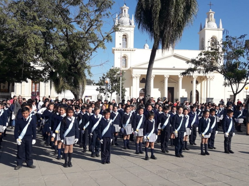 De la celebración, desarrollada en la plaza Cabral, participaron alumnos de la Escuela Nº 1 General Manuel Belgrano, oportunidad en que los chicos de 4º grado llevaron adelante la promesa de lealtad a la Bandera.