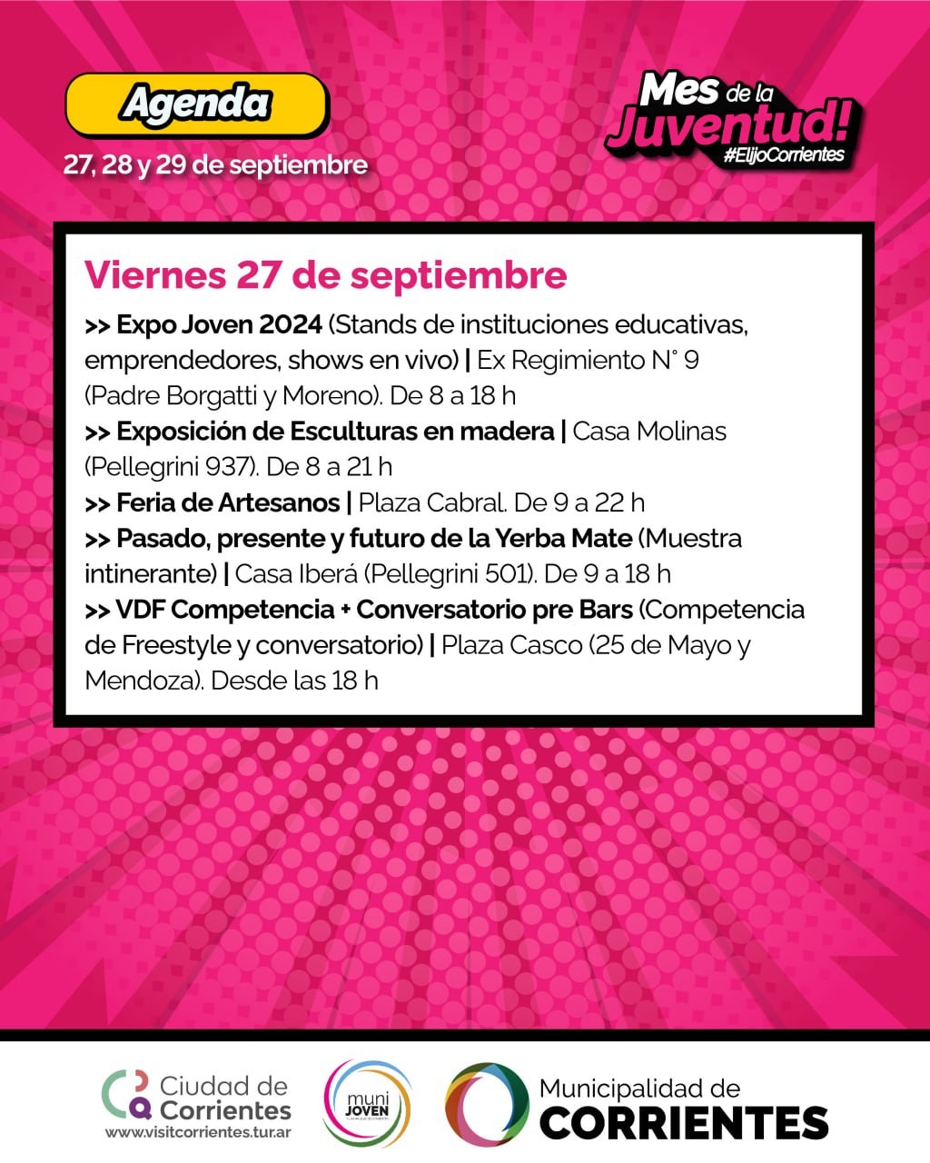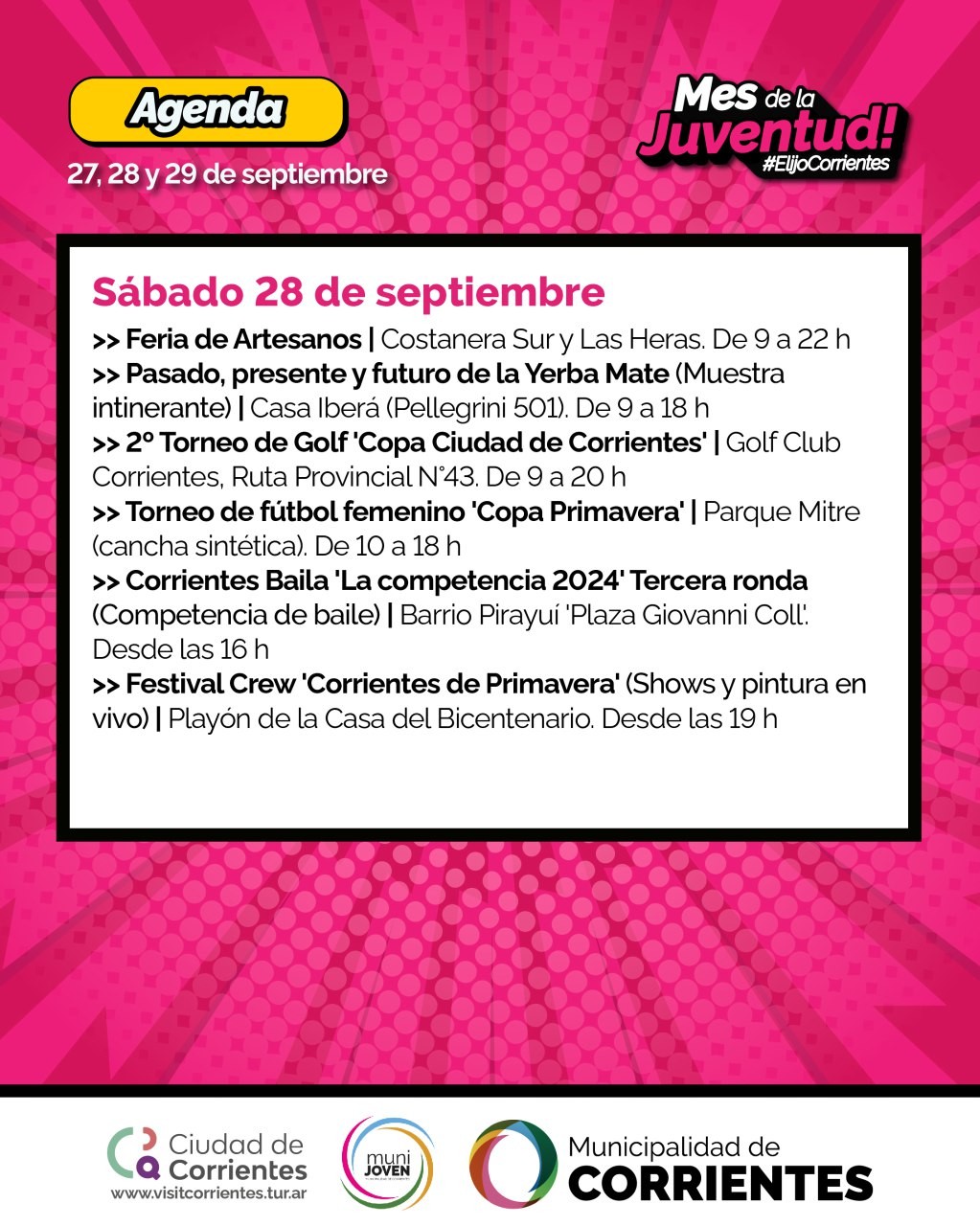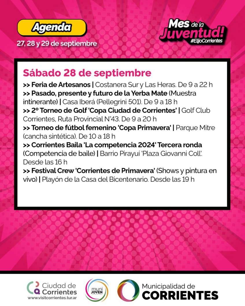 La Municipalidad de Corrientes programó actividades que se desarrollarán de viernes a domingo en distintos espacios al aire libre de la ciudad. Están previstas alternativas deportivas, musicales, la clásica Peña de la Ciudad, una celebración dedicada a los comparseros y un festival con competencias de freestyle.