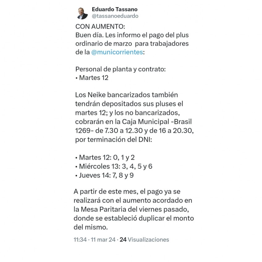 El cronograma de este plus ordinario de marzo se extenderá hasta el jueves, según anunció el intendente Eduardo Tassano a través de sus redes sociales. El incremento fue acordado el viernes último en paritarias y se duplicó el monto del mismo (sube 108%) a partir de este mes.