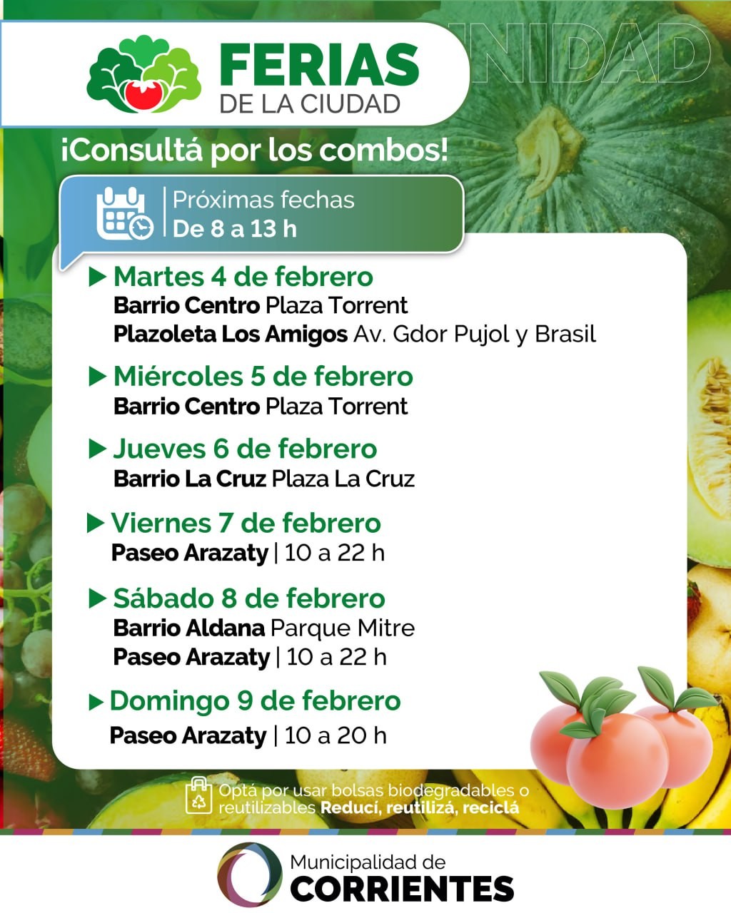Los feriantes ofrecerán interesantes combos en frutas y verduras, además de diversas promociones y ofertas. Los vecinos podrán encontrar también panificados caseros, dulces regionales, artesanías y plantas ornamentales, entre otros productos de calidad a buenos precios.
