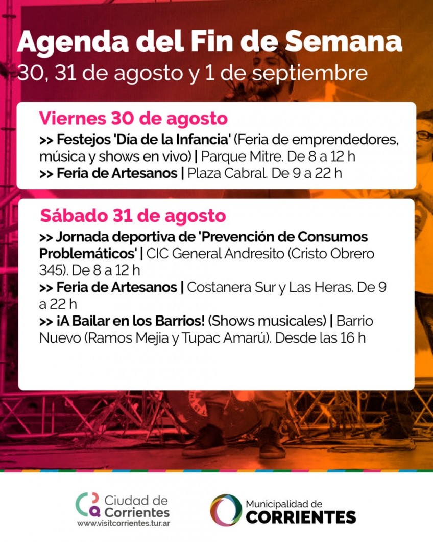 La Municipalidad de Corrientes organizó un amplio abanico de actividades para disfrutar de viernes a domingo en distintos espacios públicos de la ciudad. Habrá exposición de coleccionistas, peña chamamecera, jornadas deportivas y un evento especial como apertura del Mes de la Juventud, con bandas en vivo, DJs y muestras culturales.