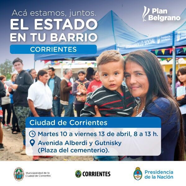 Mediante un trabajo entre los Gobiernos nacional, provincial y la Municipalidad de la Ciudad de Corrientes (MCC), el programa El Estado en tu Barrio llegará a la plaza San Juan Bautista (avenida Alberdi y Gutnisky), desde este martes 10 y hasta el viernes 13, de 8 a 13.