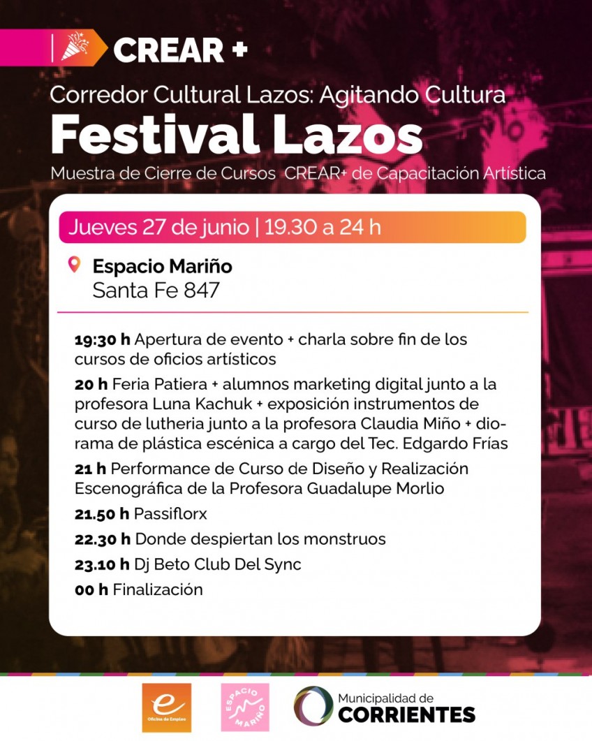 Se renueva una tradición cultural en la ciudad de Corrientes con el regreso del corredor cultural Lazos, un evento que se perfila como una cita importante para los amantes del arte y la cultura. Como parte del programa CREAR+ de la Municipalidad de Corrientes, este festival se llevará a cabo este jueves 27 de junio en el Espacio Marino (Santa Fe 847), desde las 19:30 hasta la medianoche.