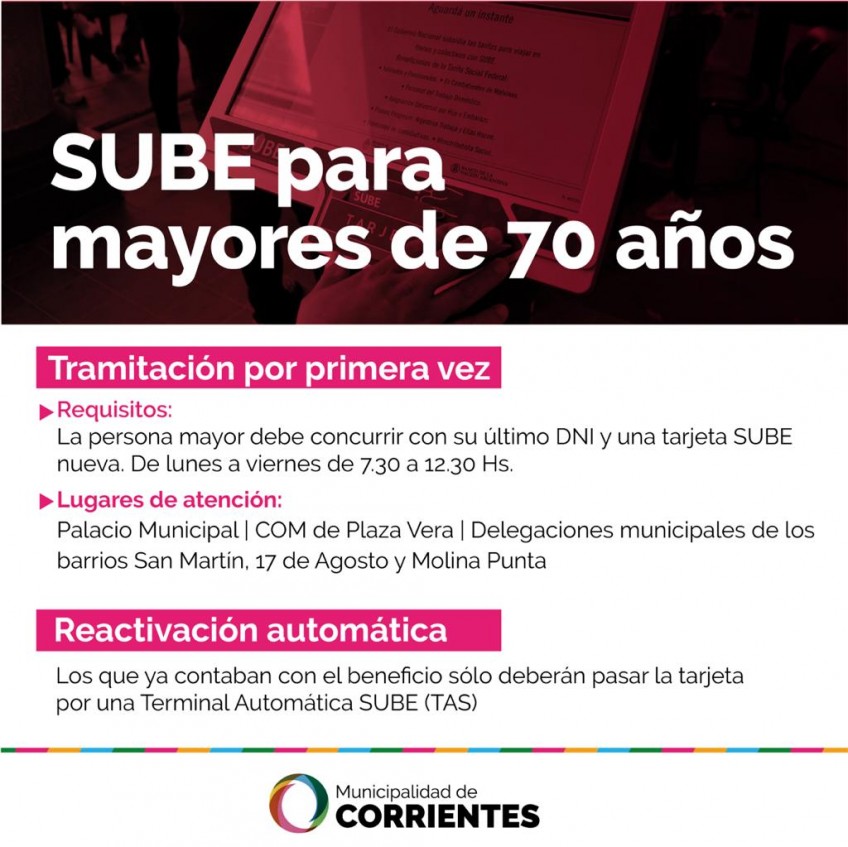 A fin de simplificar la gestión y velar por la salud de las personas mayores de 70 años, a principios de año la Municipalidad implementó un trámite de reactivación de las tarjetas SUBE para los usuarios de manera sencilla y automática: se debe pasar la tarjeta por la Terminales Automáticas de SUBE (TAS). Esta operación también puede realizarlo un familiar de la persona mayor, con la tarjeta SUBE del interesado.