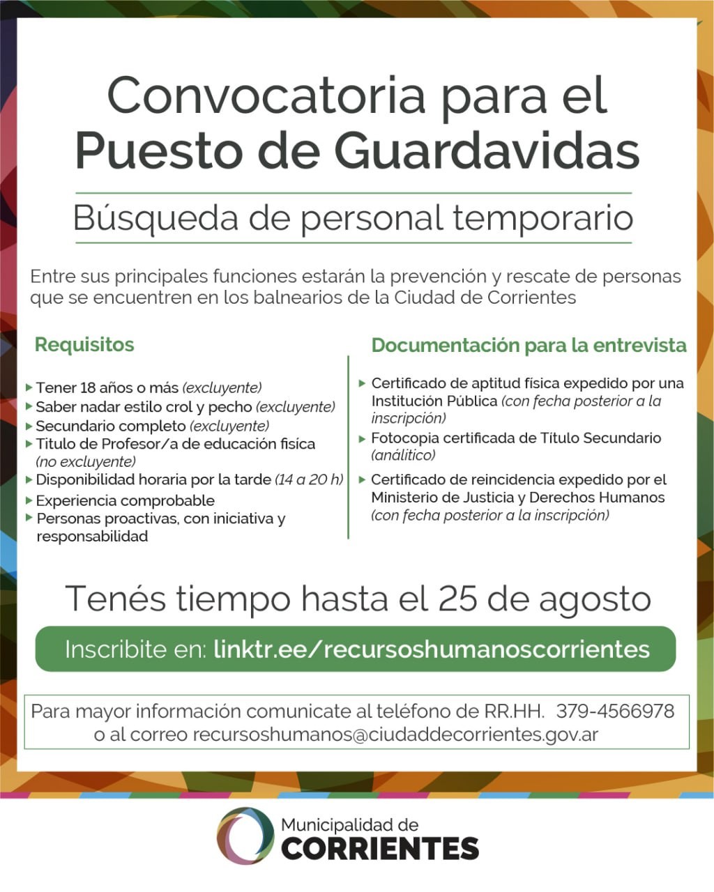 La Municipalidad de Corrientes recibirá postulaciones hasta el próximo 25 de agosto para cumplir funciones de guardavidas en las playas públicas de la ciudad. La convocatoria está dirigida a mayores de edad con disponibilidad horaria por la tarde, y se valorará tener el título de profesor de Educación Física.