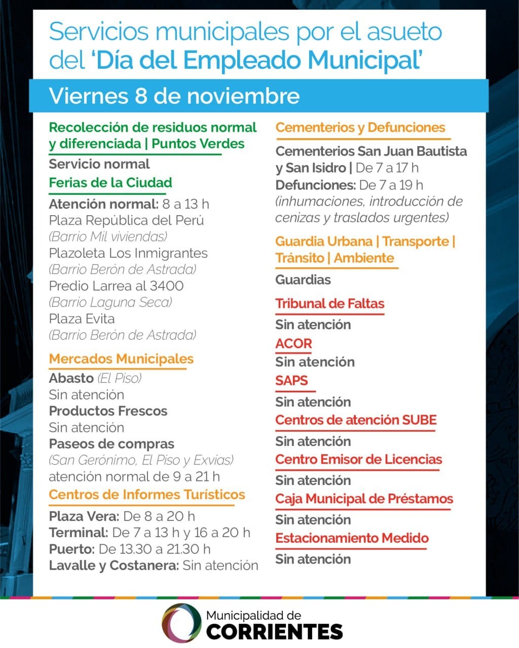 En virtud a la conmemoración por el Día del Empleado Municipal, el próximo 8 de noviembre, la Municipalidad de Corrientes informa que algunas dependencias comunales estarán cerradas, aunque se garantiza el normal funcionamiento del servicio de recolección de residuos y habrá guardias en áreas operativas. Cabe recordar que a través de la Ordenanza Nº1944, cada 8 de noviembre es día no laborable para los empleados municipales. A raíz de ello, la Agencia Correntina de Recaudación (ACOR) no brindará atención al público y retomará sus actividades el próximo lunes 11, al igual que el Centro Emisor de Licencias de Conducir, el Tribunal de Faltas, la Caja Municipal de Préstamos y las demás oficinas administrativas municipales. Las Salas de Atención Primaria de la Salud (SAPS) no estarán abiertas, ni atenderán los puntos SUBE, como tampoco habrá cobro de estacionamiento medido en la ciudad. Sin embargo, desde la Secretaría de Ambiente y Desarrollo Sustentable garantizaron que la recolección de residuos se prestará de manera normal en ambas zonas en las que está dividida la ciudad. Lo mismo ocurrirá con la recolección diferenciada que va a funcionar como es habitual, en los barrios que cuentan con este servicio para el reciclaje. Asimismo, habrá un servicio de guardia en la Dirección General de Defunciones, de 7 a 19, en la oficina de calle 25 de Mayo 1178, para trámites urgentes como inhumaciones, introducción de cenizas y traslados urgentes. En tanto que los cementerios San Juan Bautista y de Laguna Brava estarán abiertos, de 7 a 17. Los mercados de Abasto (El Piso) y de Productos Frescos no abrirán sus puertas, mientras que los distintos Paseos de Compras abrirán, de 9 a 21. Las Ferias de la Ciudad trabajarán normalmente el viernes 8, estarán en simultáneo en la plaza República del Perú de las Mil Viviendas; en la plazoleta Los Inmigrantes del barrio Berón de Astrada; en el predio de Larrea al 3400 (frente al Colegio Illia) del barrio Laguna Seca; y en la plaza Evita (Sarmiento y Maipú) del barrio Berón de Astrada. Desde la Subsecretaría de Turismo se informó que los Centros de Informes Turísticos tendrán esta modalidad de atención con guardias para el viernes: Terminal, de 7 a 13 y de 16 a 20, Plaza Vera, de 8 a 20. Paseo del Puerto, de 13:30 a 21:30. En tanto que las áreas operativas de Tránsito, Guardia Urbana, Transporte, barrido de calles, brindarán sus servicios con personal de guardia.
