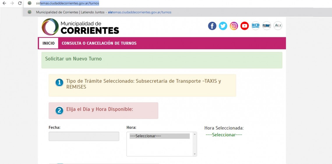 Para evitar aglomeración de personas y teniendo en cuenta las medidas de prevención ante el Covid-19; a través de la página web todos aquellos que necesitaban habilitaciones referentes a transporte de carga, remises y taxis podían hacerlo de manera ágil y sencilla. Simplemente ingresando a: https://sistemas.ciudaddecorrientes.gov.ar/turnos/ se brindan los turnos para: habilitación por primera vez o renovación; cambio de chofer; cambio de agencia; carnet único de transporte y ticket; y cambio de unidad de taxi.