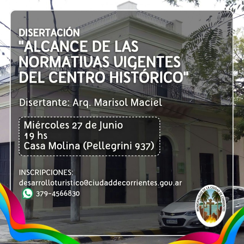 La Municipalidad de Corrientes invita a arquitectos e ingenieros -entre otros profesionales-, personal municipal que se desempeña en atención al turista, alumnos de diversas tecnicaturas y público en general a participar de la disertación sobre "Alcance de las normativas vigentes del centro histórico".