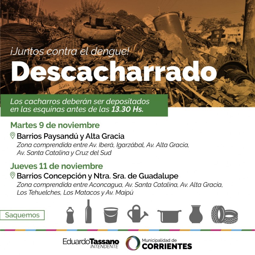 La Municipalidad de Corrientes informó que los operativos de descacharrado llegarán el martes y jueves a otros barrios capitalinos. A las 13.30 pasarán los camiones a recolectar todos los elementos en desuso que puedan ser reservorios del mosquito Aedes aegypti.