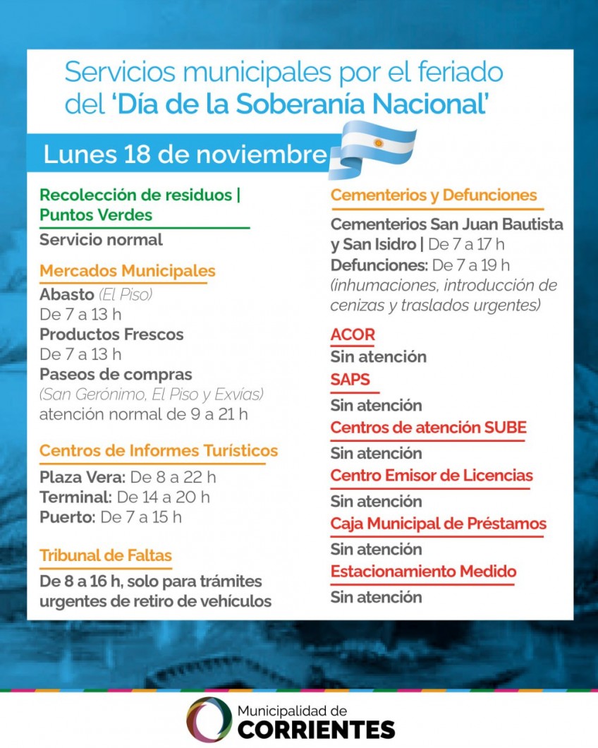 En cambio no abrirán sus puertas la Agencia Correntina de Recaudación (ACOR), el Centro Emisor de Licencias (CEL) de conducir, la Caja Municipal de Préstamo (CMP), las Salas de Atención Primaria de la Salud (SAPS), y las demás oficinas administrativas, que volverán a funcionar normalmente el martes 19 de noviembre.