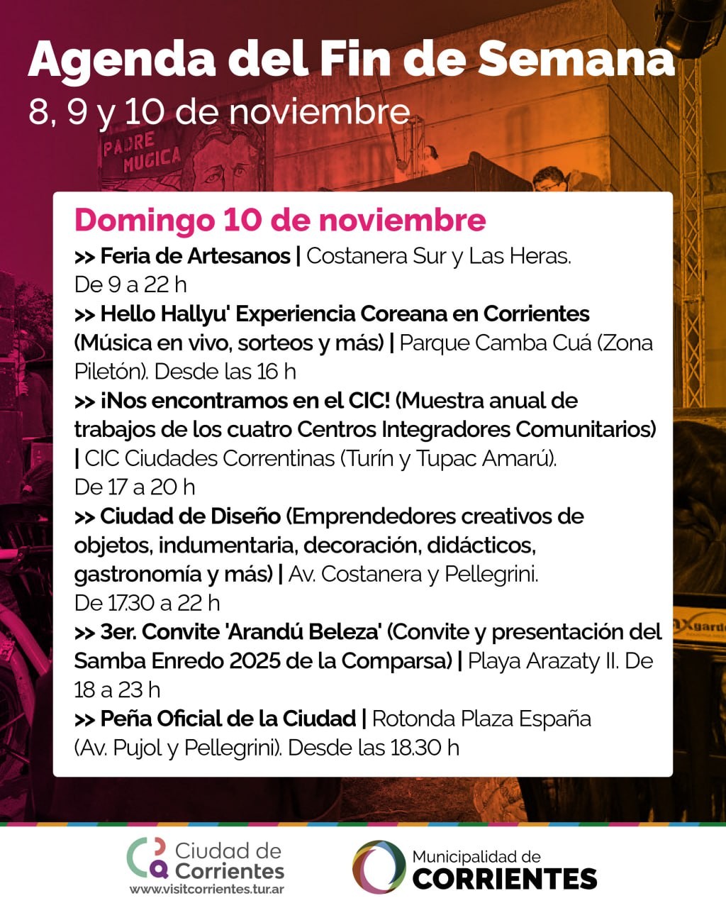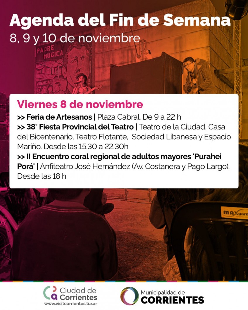 Como cada fin de semana, la Municipalidad de la ciudad de Corrientes pone a disposición de vecinos y visitantes una variada agenda de espectáculos para grandes y chicos. En esta oportunidad, la oferta incluye obras de teatro, calistenia y recorridos guiados por lugares emblemáticos de la ciudad, entre muchos otros.