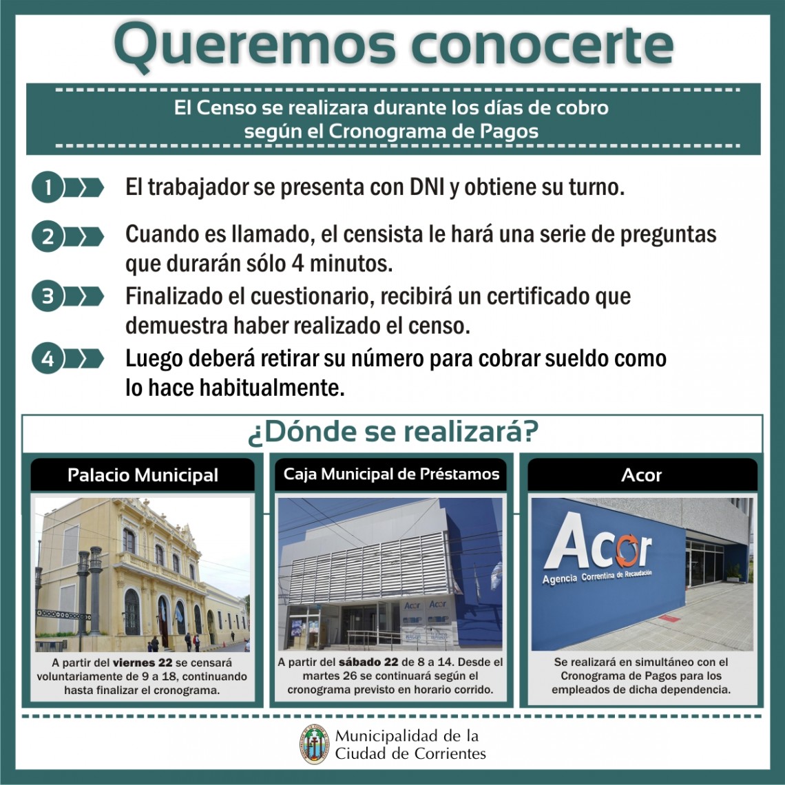 La Municipalidad de Corrientes comenzará a partir de mañana un censo a sus trabajadores para realizar un diagnóstico de situación y reorganizar las respectivas dependencias comunales. Será a partir de este viernes 22 y se desarrollará en paralelo al cronograma de pago en el Palacio Municipal, la Caja Municipal de Préstamos y en la Agencia Correntina de Recaudación.