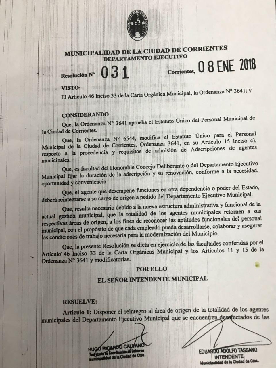 Por resolución municipal el personal que figura adscripto a otra dependencia deberá volver al ámbito de la Municipalidad, así lo dispuso el Intendente Eduardo Tassano. La resolución que se hizo pública el día de hoy figura en los trasparentes del palacio municipal y fue notificada al Honorable Concejo deliberante y a distintas dependencias.