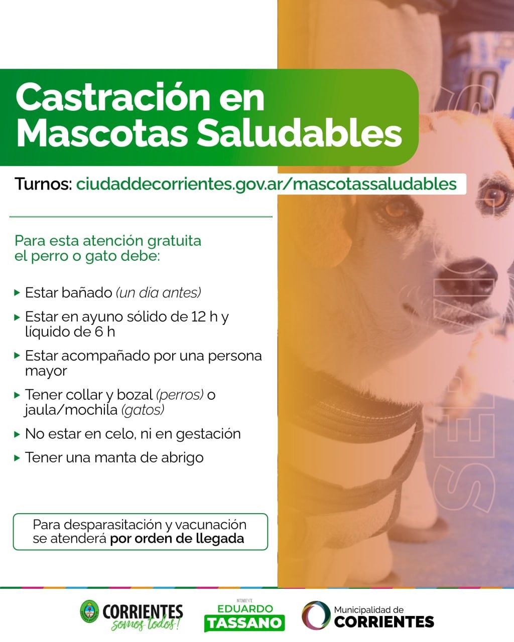 En todos los casos, La Muni en tu Barrio está acompañado del programa Mascotas Saludables, que promueve la tenencia responsable de los animales domésticos, acercando atención veterinaria gratuita, vacunación antirrábica, desparasitaciones, y esterilizaciones (castraciones). Este último servicio debe requerirse con antelación a través del turnero web (https://ciudaddecorrientes.