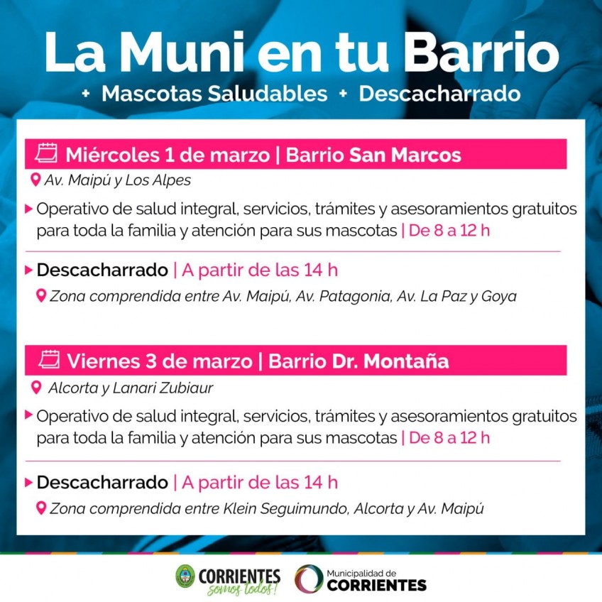 Las prestaciones gratuitas incluidas en la Muni En Tu Barrio se brindarán desde la semana próxima, todos los miércoles y viernes, comenzando el 1 de marzo, de 8 a 12, en el San Marcos y el viernes 3 en el Doctor Montaña. En esa franja horaria se realizará también el operativo de Mascotas Saludables y, por la tarde, se llevarán a cabo tareas de descacharrado.