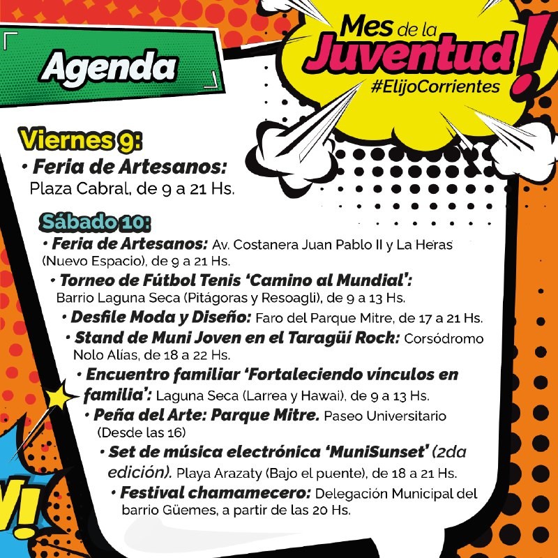 Como parte del Mes de la Juventud, la Municipalidad de la ciudad de Corrientes ofrecerá un abanico de propuestas gratuitas para disfrutar este fin de semana. Habrá patio gastronómico, intervenciones artísticas, festival chamamecero, actividades deportivas y acompañará al festival de rock organizado por el Gobierno de la provincia.