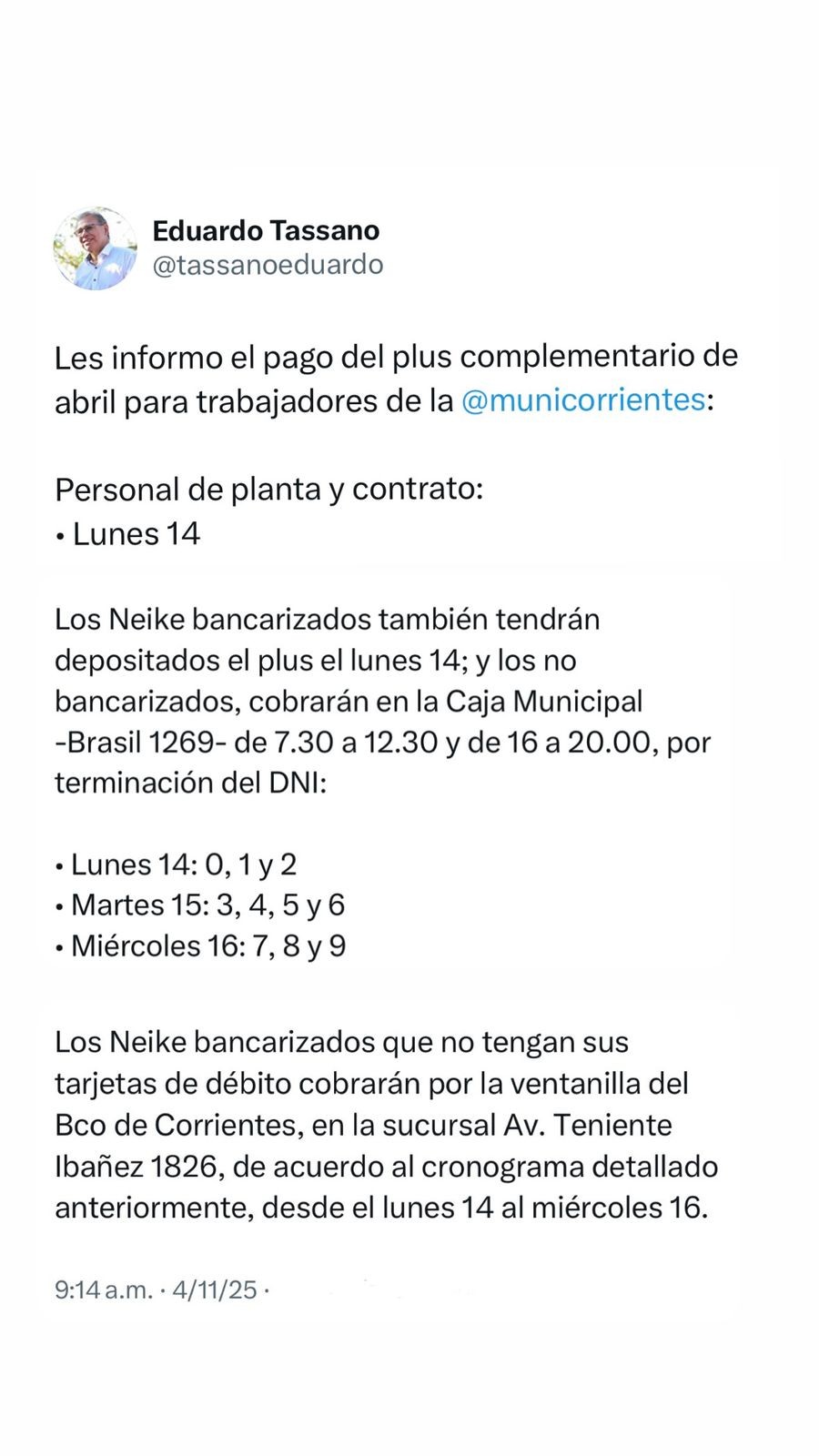 En tanto, los Neike bancarizados pero que no poseen tarjeta de débito, deberán cobrar por ventanilla del Banco de Corrientes (sucursal av. Teniente Ibáñez 1826) de acuerdo al cronograma detallado anteriormente.