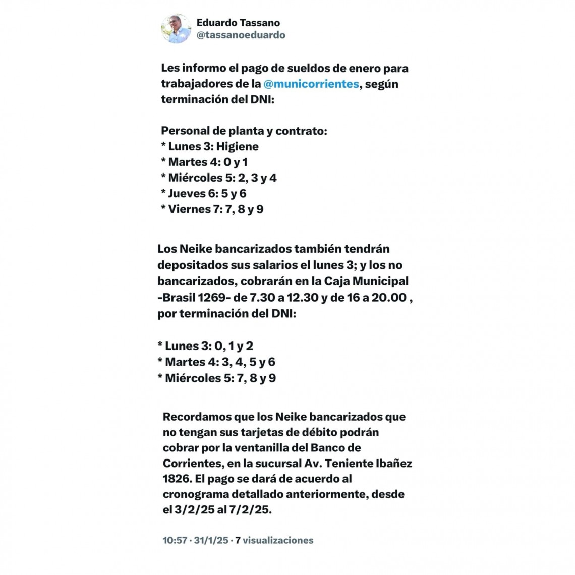 En tanto que los Neike bancarizados, pero sin tarjeta de débito, podrán cobrar en la sucursal del Banco de Corrientes de Teniente Ibáñez 1826. Este segmento de trabajadores deberá regirse por el cronograma con terminación de DNI detallado anteriormente y que va del lunes 3 de febrero al viernes 7 de febrero.