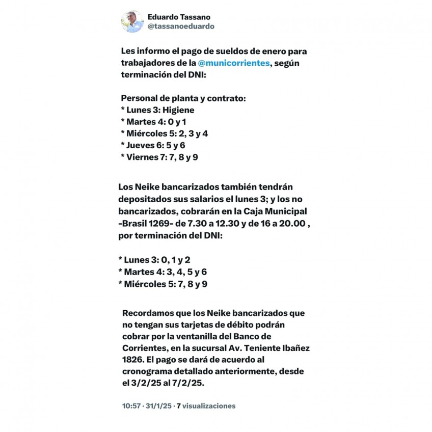 El cronograma salarial de enero se extenderá hasta el viernes 7 de febrero, según lo anunció el intendente Eduardo Tassano a través de sus redes sociales.