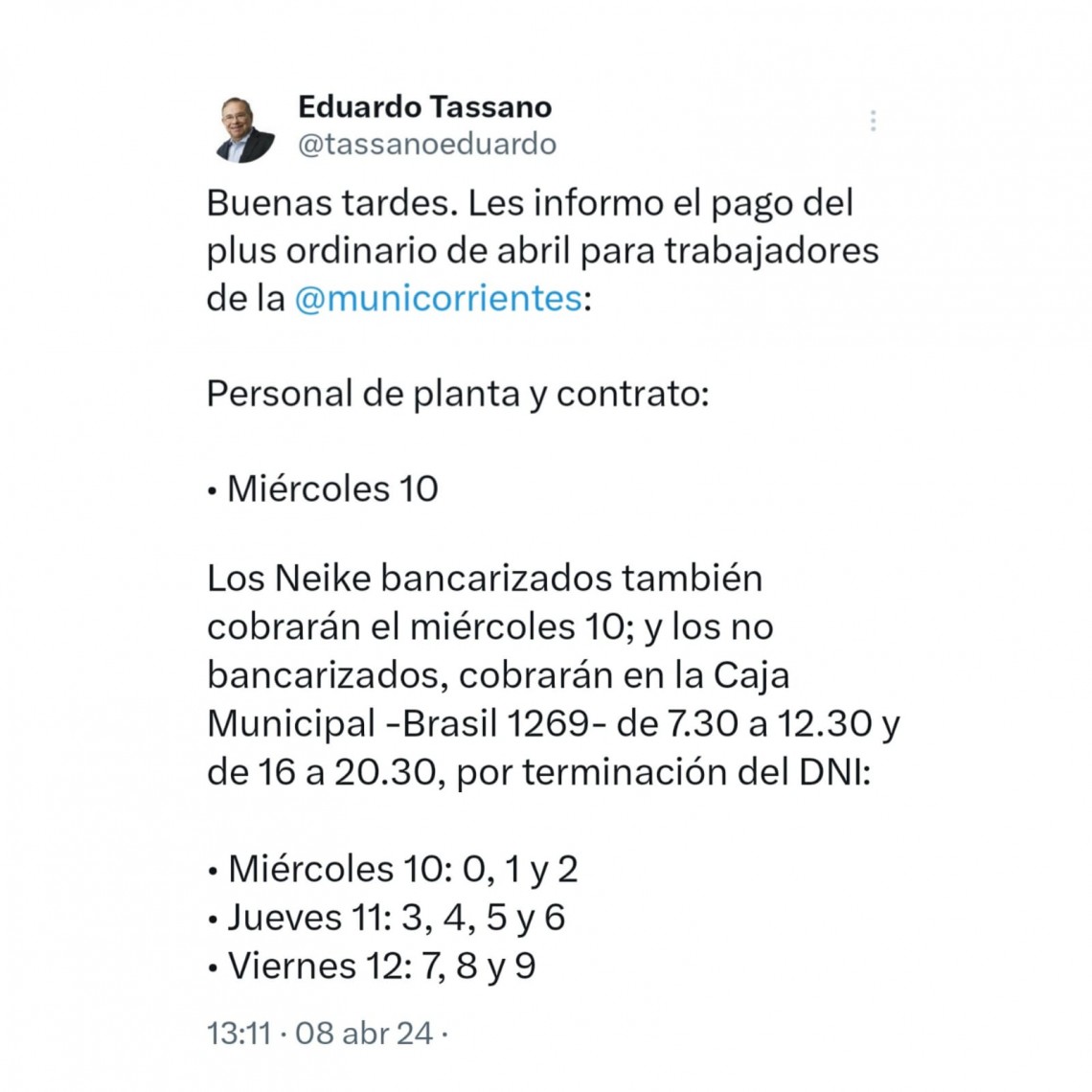 El cronograma de este plus ordinario de abril se extenderá hasta el viernes, según anunció el intendente Eduardo Tassano a través de sus redes.