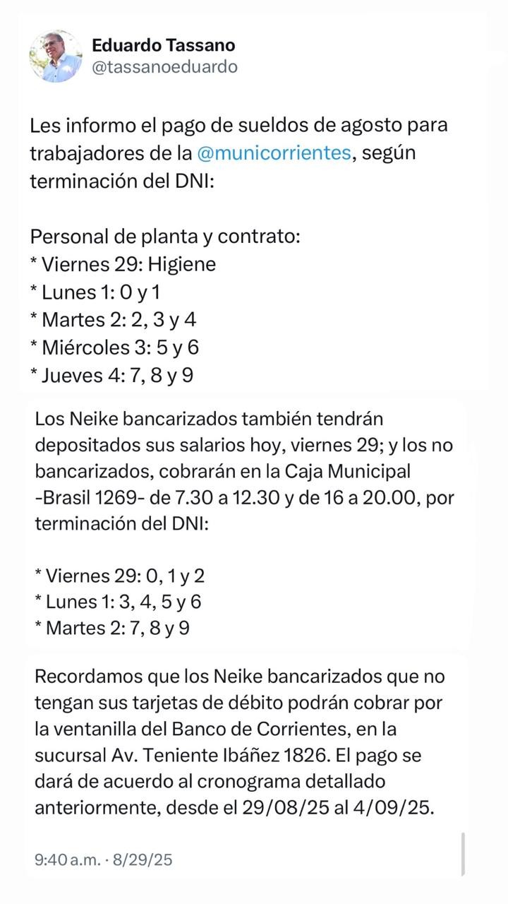 El cronograma salarial de agosto se extenderá hasta el jueves 4 de septiembre, según lo anunció el intendente Eduardo Tassano a través de sus redes sociales.