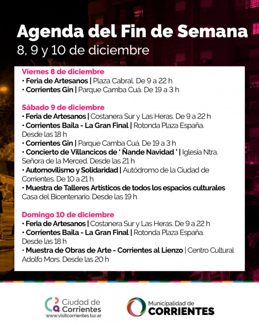 La Municipalidad de la ciudad de Corrientes programó una serie de actividades que tendrán lugar de viernes a domingo, como siempre con acceso gratuito. Como parte de las alternativas habrá feria de artesanos, ciclos de música, gin y gastronomía y villancicos además de la gran final del certamen “Corrientes baila”.