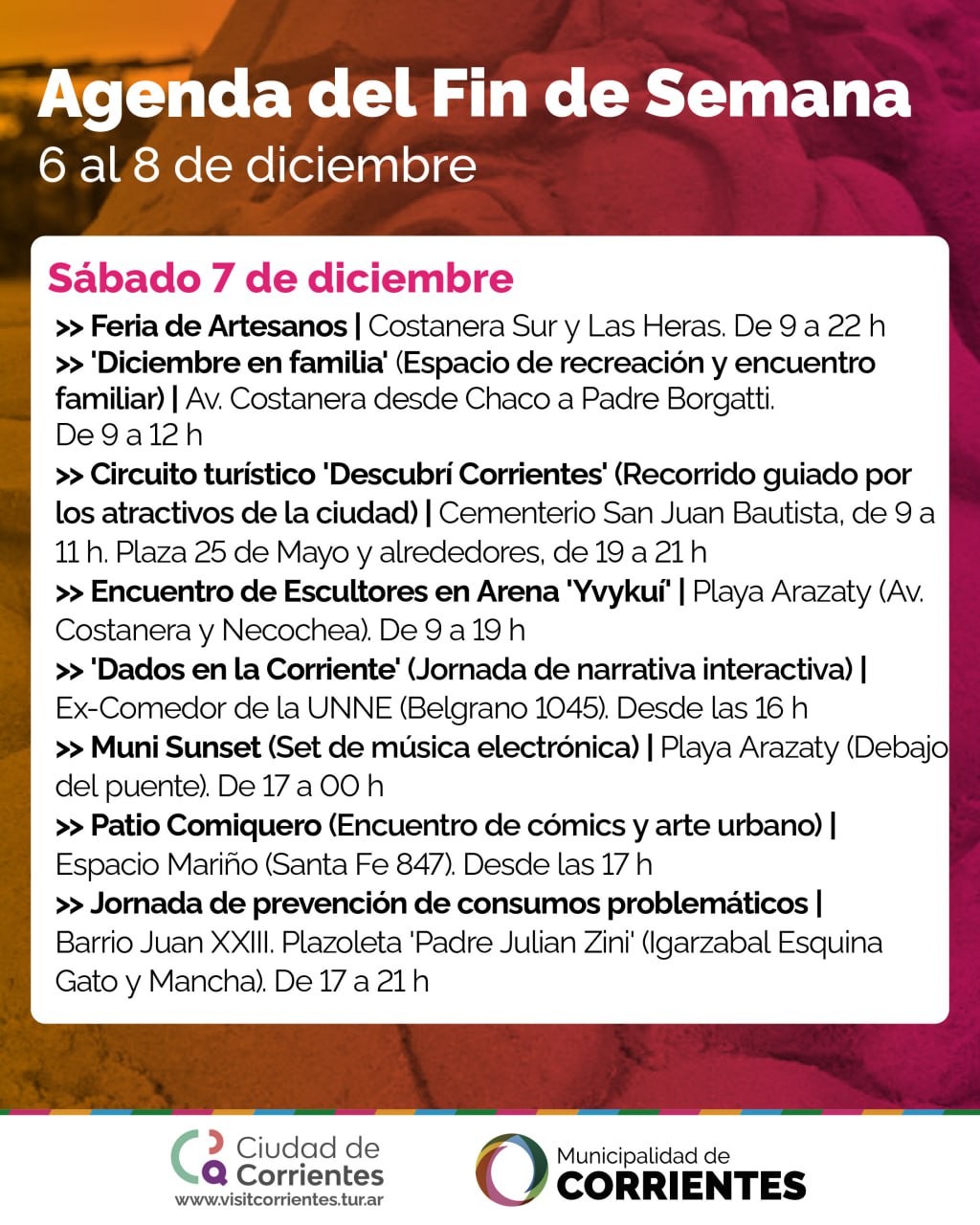 Como cada fin de semana, la Municipalidad de Corrientes pone a disposición de vecinos y turistas una amplia gama de ofertas para el disfrute de grandes y chicos. Entre las propuestas habrá ferias de artesanos y de adornos navideños, entrega de premios a maratonistas, esculturas en arena, jornadas de recreación, chamamé, música electrónica y latinoamericana, recorridos pedestres, encuentros de comics y desfile de modas.