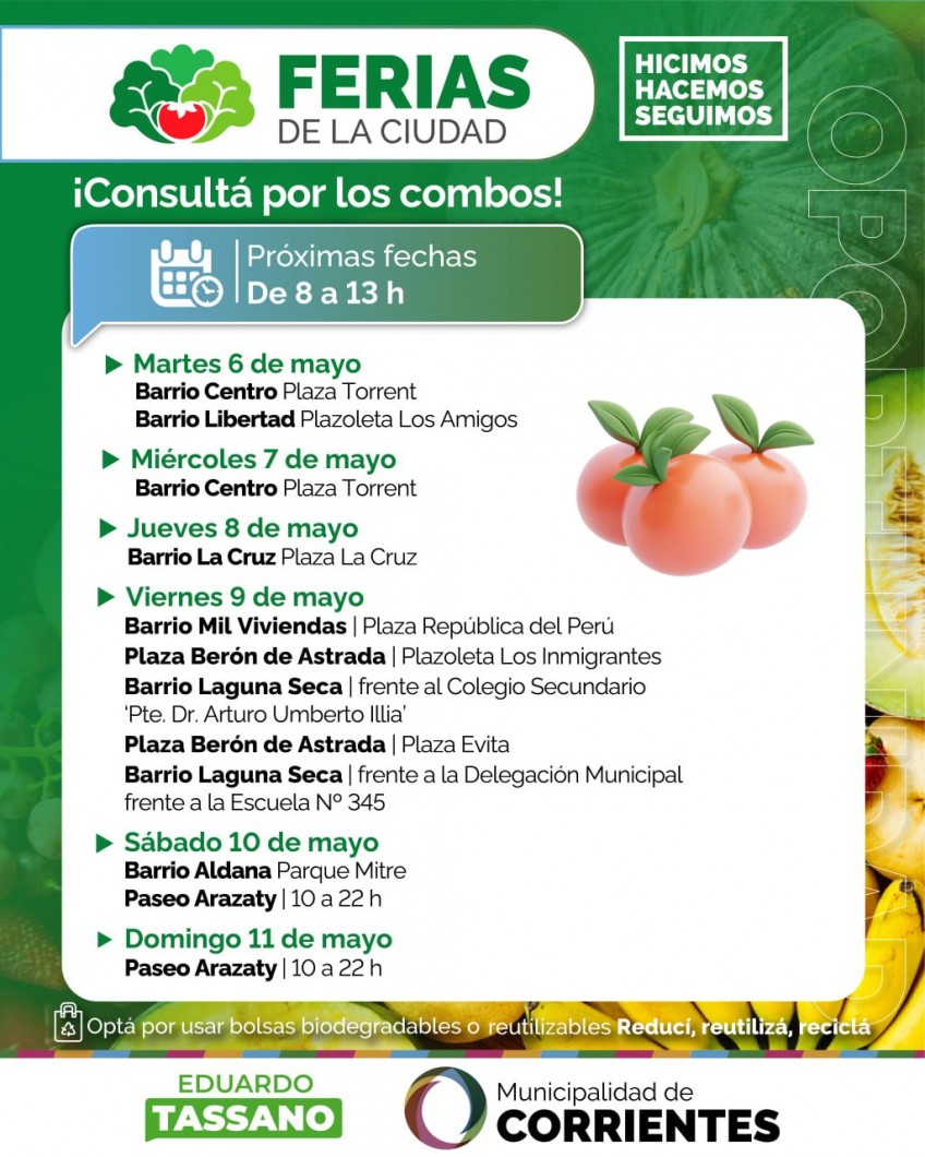 La Municipalidad de Corrientes continúa acercando productos de calidad, con interesantes ofertas y combos, a diferentes barrios, a través de las Ferias de la Ciudad. La actividad es coordinada por la Secretaría de Desarrollo Económico municipal, a través de la Subsecretaría de Economía Social.