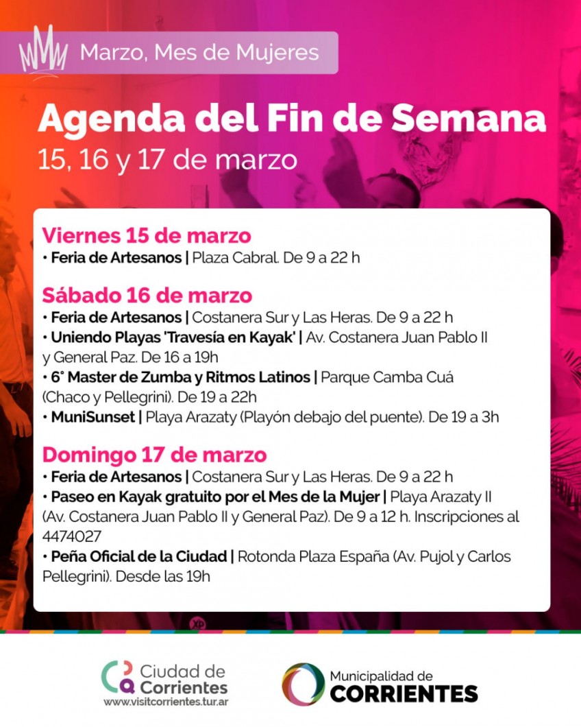 La Municipalidad de Corrientes ofrece una amplia oferta de actividades gratuitas para vecinos y turistas. Se destacan paseos en kayak, zumba, música electrónica, peña y las playas públicas con todos sus servicios.
