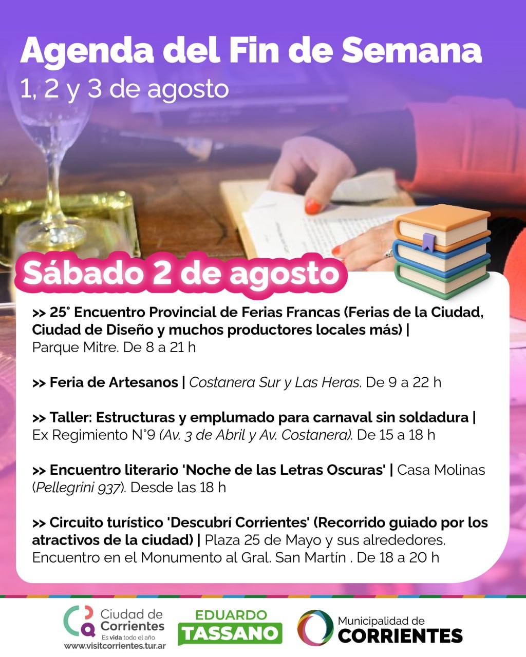Como cada fin de semana, la Municipalidad de Corrientes ofrecerá de viernes a domingo un amplio abanico de propuestas culturales y recreativas para toda la familia. Entre ellas, habrá degustación de caña con ruda, ferias de productores, artesanos y emprendedores, visitas guiadas por la ciudad y la clásica Peña de la Ciudad.