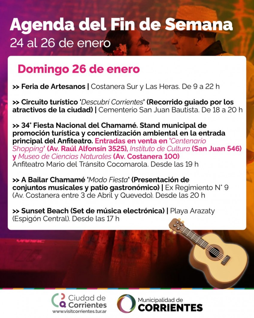 Como cada fin de semana, la Municipalidad de la ciudad de Corrientes propone una variada agenda cultural que incluye música, baile, deportes y actividades recreativas para grandes y chicos. Todas las propuestas son totalmente gratuitas y están pensadas para el disfrute de las familias que eligen Corrientes para disfrutar del verano.