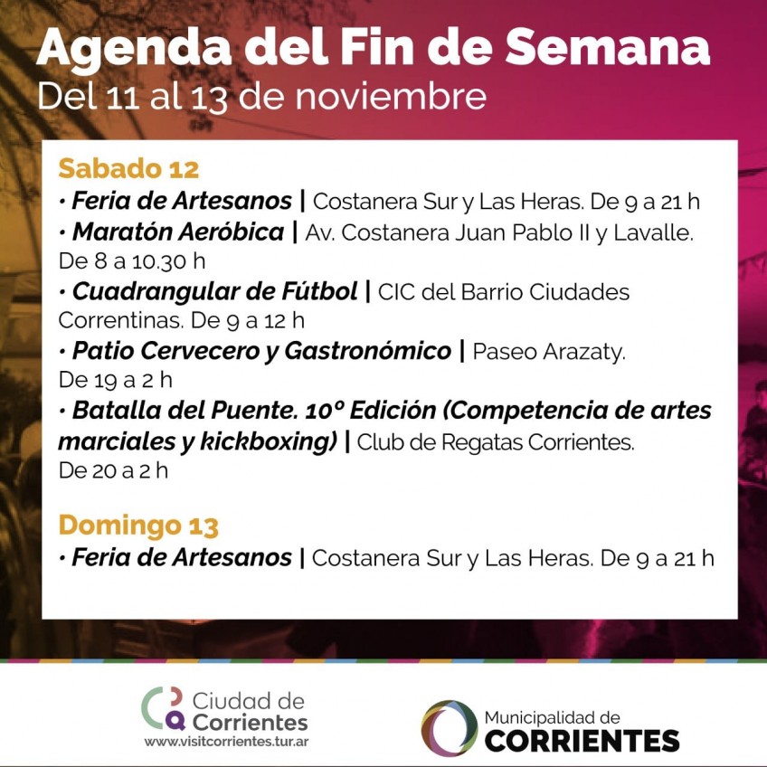 Como cada fin de semana, la Municipalidad ofrece distintas alternativas para el disfrute de los vecinos de Corrientes y de quienes visitan la ciudad. Del jueves al domingo se realizarán múltiples actividades culturales, deportivas y de entretenimiento en diversos puntos de la capital, siempre y cuando las condiciones del tiempo acompañen.