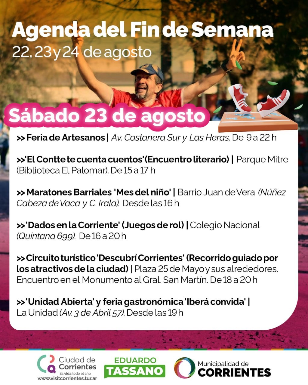 Desde el viernes y hasta el domingo, la Municipalidad de Corrientes preparó una atractiva agenda de actividades para grandes y chicos. Las propuestas que se desarrollarán en distintos espacios de la ciudad incluyen ferias, visitas guiadas, espacios gastronómicos, encuentros literarios, peñas y mucho más.