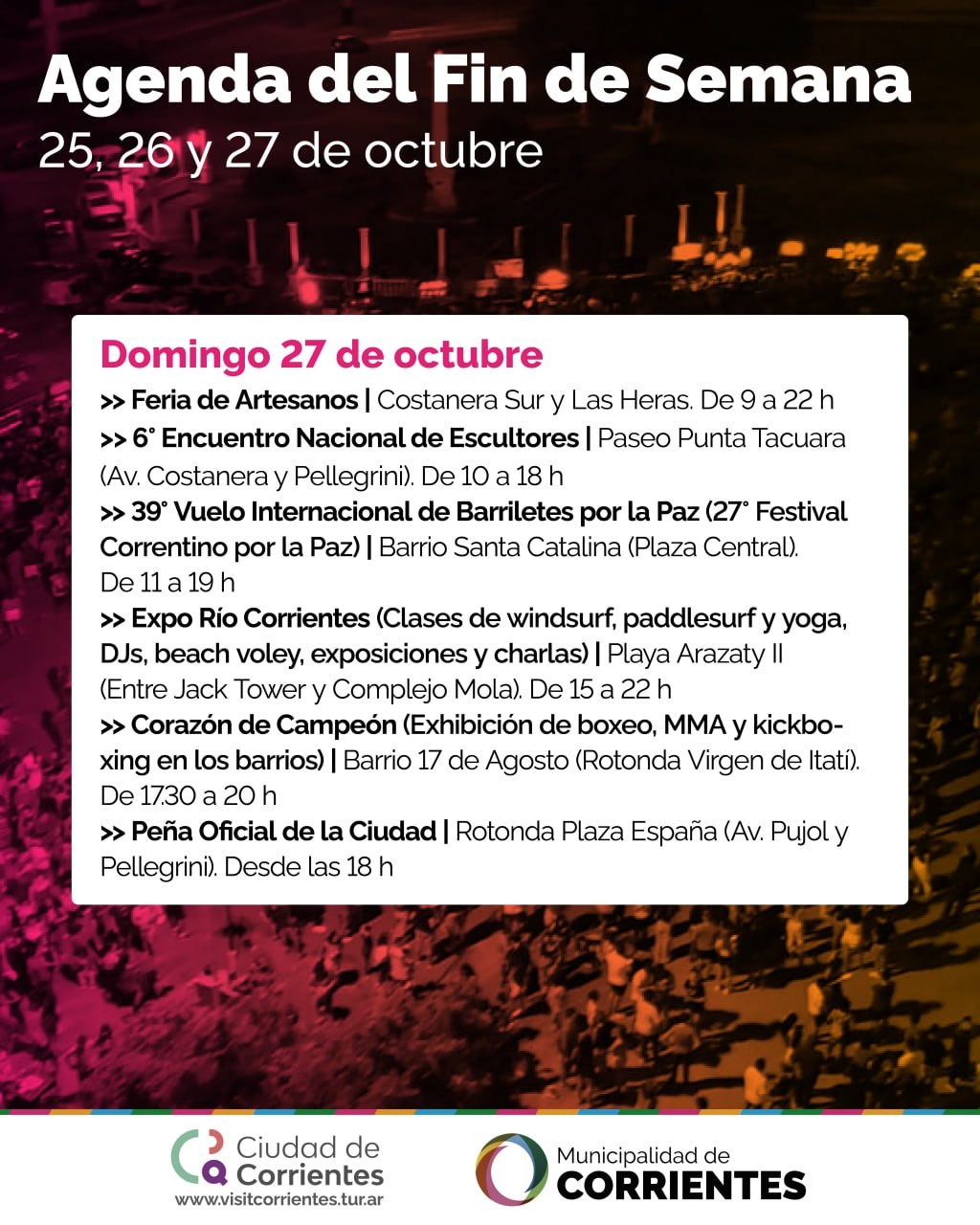 La Municipalidad de Corrientes pone a disposición de vecinos y visitantes una amplia agenda de actividades para disfrutar al aire libre. Las alternativas totalmente gratuitas, incluyen feria de autos clásicos, Oktober Fest del Litoral, la Noche de los Museos, encuentro de escultores, peña, maratón, y mucho más.
