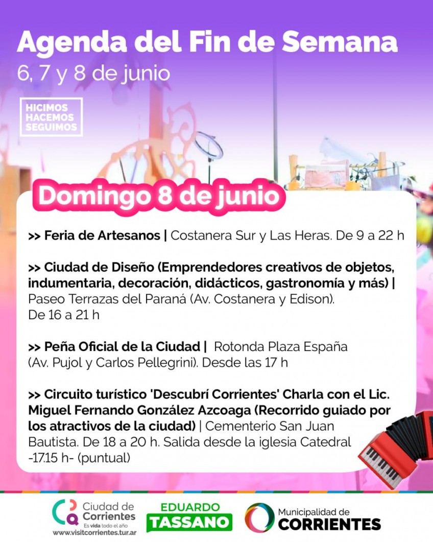El primer fin de semana de junio llega con una amplia oferta de actividades para vecinos y visitantes. Como es costumbre, la Municipalidad de Corrientes organizó una variada agenda que se desarrollará desde el viernes al domingo. En diferentes espacios al aire libre, se podrá disfrutar de recorridos guiados, ferias, actividades deportivas y homenaje a la colectividad italiana, entre muchas otras alternativas.