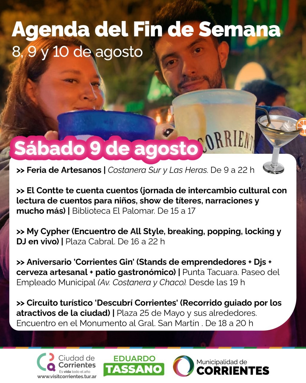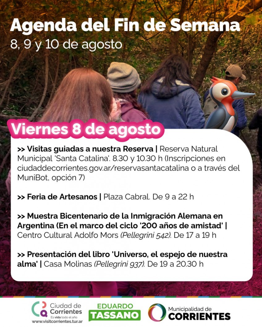 Como cada fin de semana, desde la Municipalidad de Corrientes se propone un amplio abanico de ofertas de recreación y esparcimiento para grandes y chicos. Entre las alternativas habrá visitas guiadas a la Reserva Municipal, a los mausoleos de la ciudad, ferias de artesanos, feria de emprendedores, muestra de la cultura alemana, celebración japonesa, presentación de libros, "Corrientes gin", ciclismo, entre otras. Todas son totalmente gratuitas.