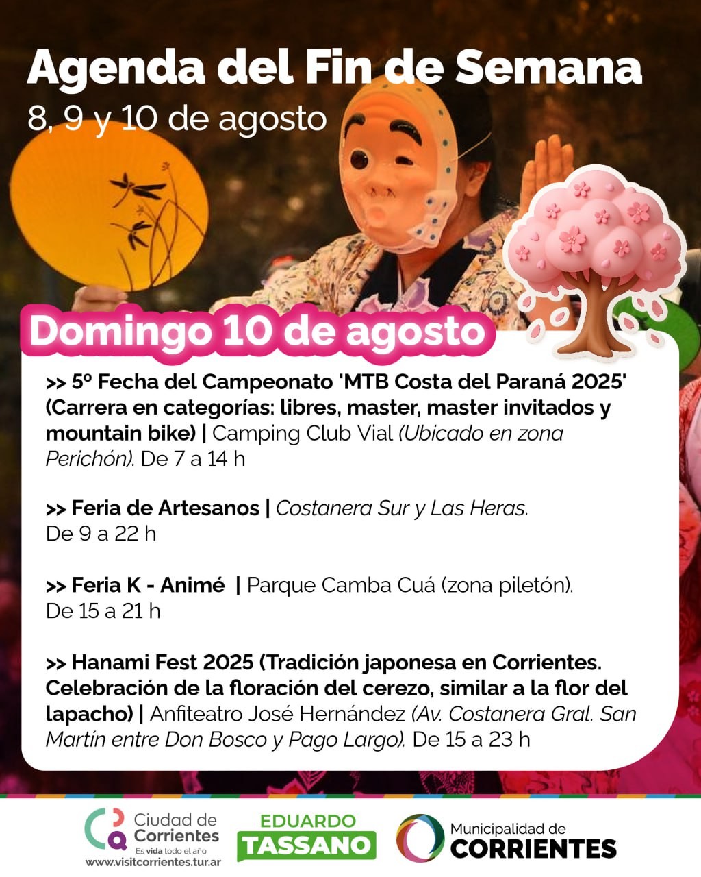 La Municipalidad de Corrientes diagramó distintas actividades totalmente gratuitas y abiertas a todo público, que se desarrollarán de viernes a domingo para chicos y grandes. Entre las propuestas habrá ediciones especiales de Ciudad Diseño y K-Animé, de cara al Día de las Infancias. Además, están previstos: “Corrientes Gin” con gastronomía y tragos, la celebración japonesa Hanami Fest, visitas guiadas, ciclismo, entre varias otras.