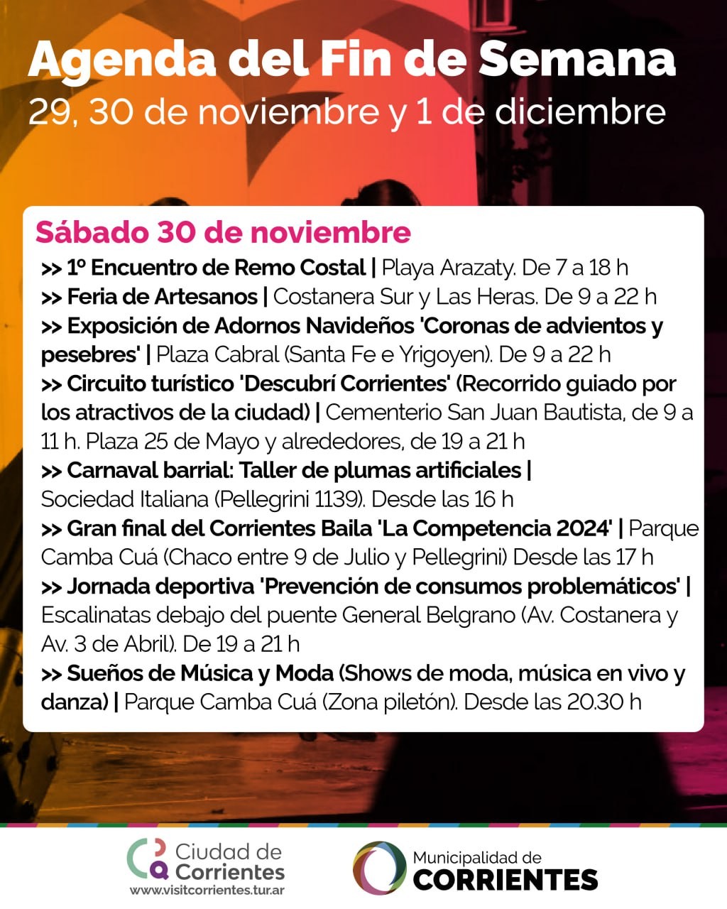 Una vez más, la Municipalidad de la ciudad de Corrientes pone a disposición de vecinos y turistas una amplia gama de ofertas para el disfrute de grandes y chicos. Entre las propuestas habrá chamamé, teatro, remo, boxeo, talleres de carnaval, presentación de tema de comparsas, moda, música y danza.