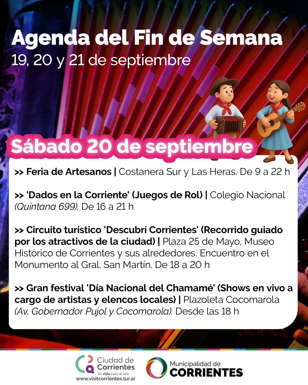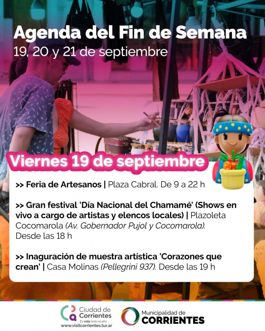 Como cada fin de semana, desde la Municipalidad de Corrientes se propone un amplio abanico de ofertas culturales y de esparcimiento para locales y turistas. Entre las alternativas habrá actividades por el Día Nacional del Chamamé, Ciudad Diseño, recorridas pedestres, entre otras. Todas las propuestas son totalmente gratuitas y abiertas a todo público.