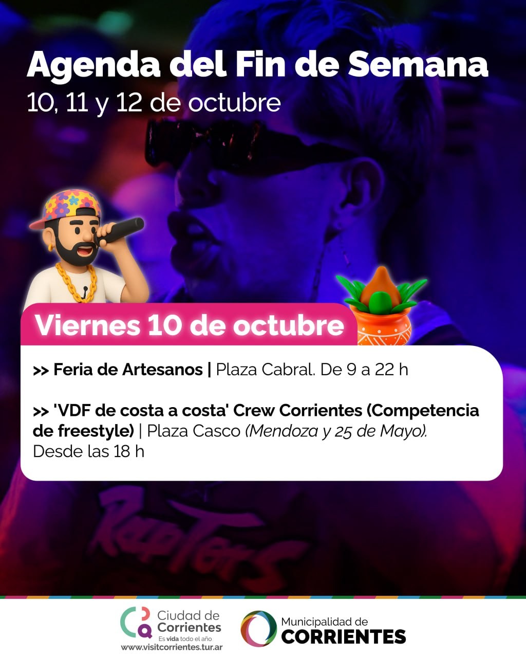 De cara a un fin de semana largo, por el feriado nacional por el Día del Respeto a la Diversidad Cultural, la Municipalidad de Corrientes propone un amplio abanico de ofertas culturales y de esparcimiento para vecinos y turistas. Entre las alternativas previstas habrá freestyle, una nueva edición de maratones barriales, ferias de emprendedores, visitas pedestres guiadas, peña y más opciones para el disfrute de grandes y chicos.