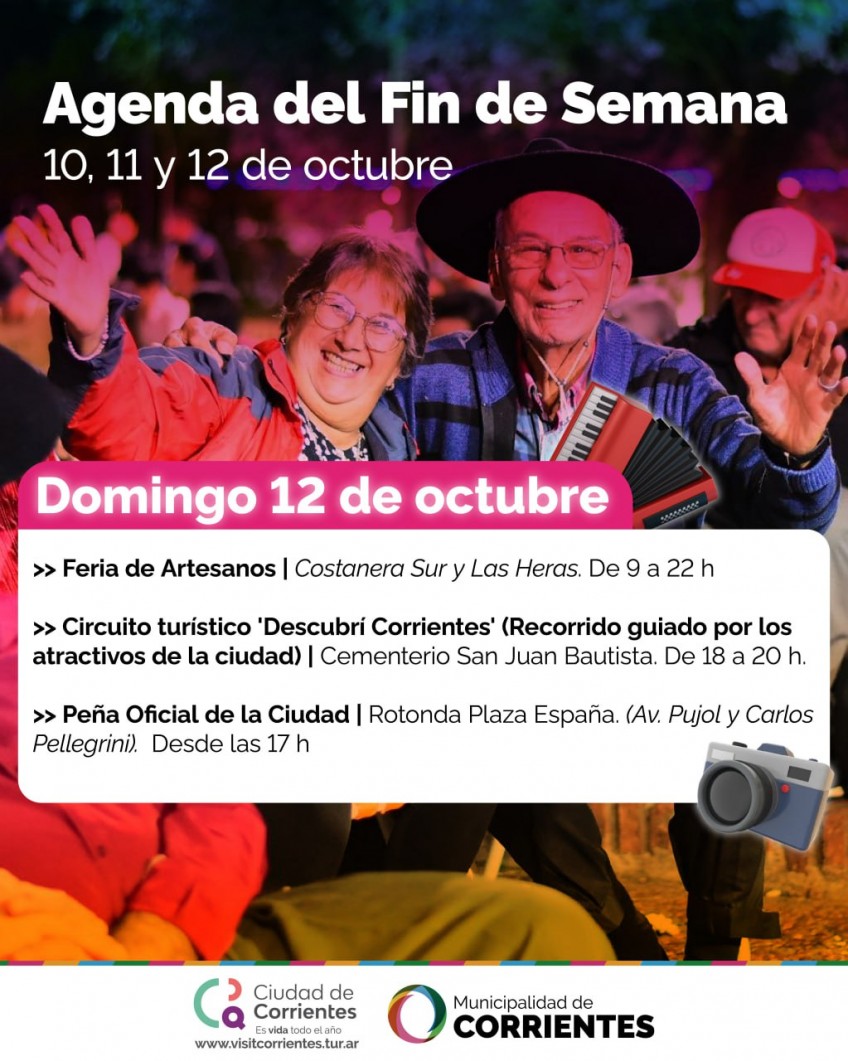 Desde el viernes y hasta el domingo, la Municipalidad de Corrientes preparó una agenda con diversas actividades al aire libre. Las propuestas que se desarrollarán en distintos espacios de la ciudad incluyen música para todos los gustos, danza, ferias de emprendedores y artesanos, deporte y mucho más. Todas las propuestas son totalmente gratuitas.