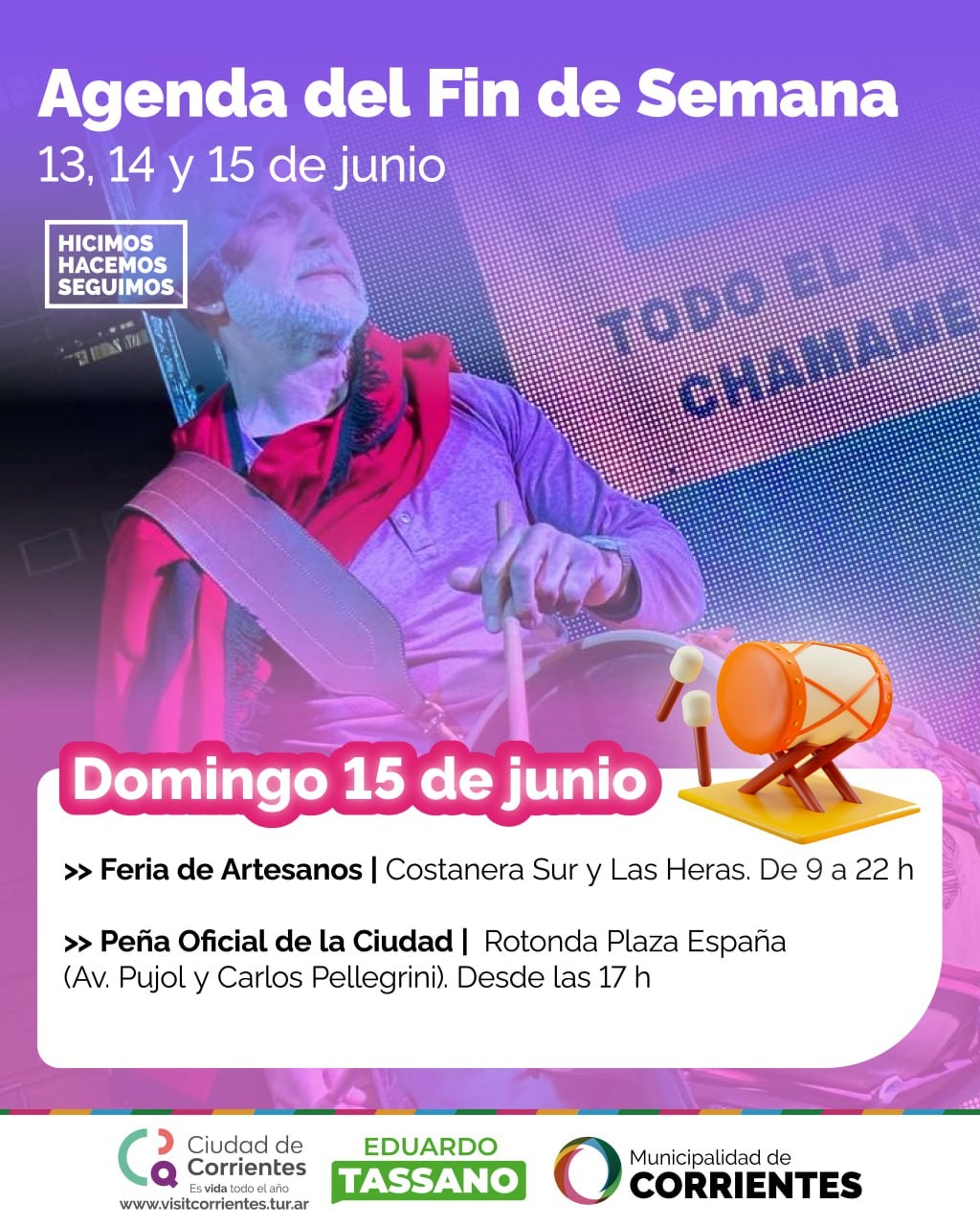 El domingo 15, en tanto, la Peña Oficial de la Ciudad se desarrollará a partir de las 17 en la rotonda plaza España (Av. Pujol y Carlos Pellegrini). En esta oportunidad, actuarán: el elenco municipal Selva Guaraní, Las Estrellas del Litoral, Los Hermanos Velázquez, Ricardo Cenit y su conjunto, Los Puros del Chamamé, Ariel Gaúna y la Nueva Propuesta. Habrá además feria gastronómica y emprendedora.