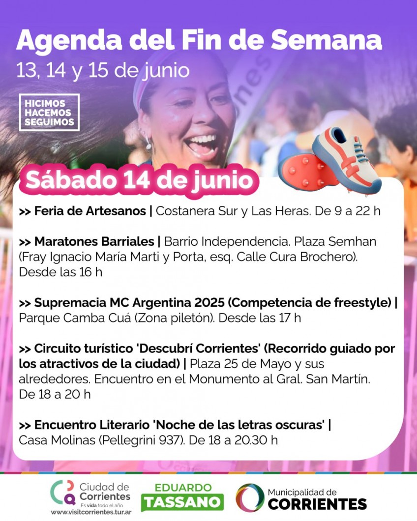Se viene un fin de semana largo y especial, por ello, desde la Municipalidad de Corrientes se organizó una variada agenda de actividades que se desarrollará desde el viernes al domingo. En diferentes espacios al aire libre se podrá disfrutar de recorridos guiados, ferias, maratones, encuentros literarios, homenajes a poetas, competencias de freestyle y la clásica peña chamamecera.