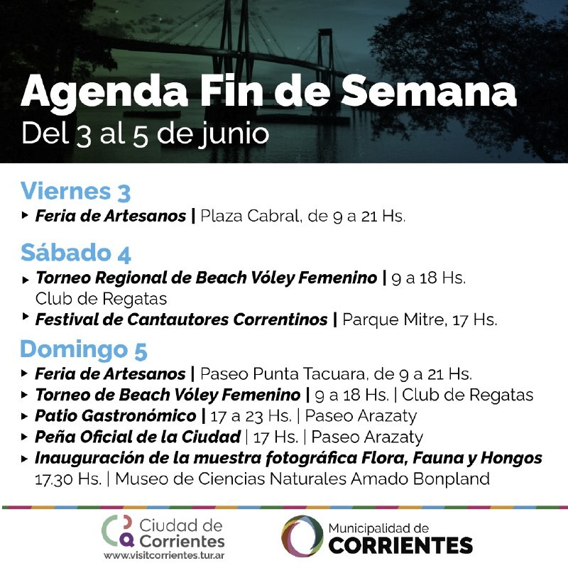 En diferentes puntos de la ciudad, la Municipalidad dispone para este fin de semana variadas opciones recreativas para el disfrute de vecinos y turistas. Habrá muestra fotográfica, paseo de artesanos, deportes, recorridos guiados, peña chamamecera, entre otras propuestas gratuitas.