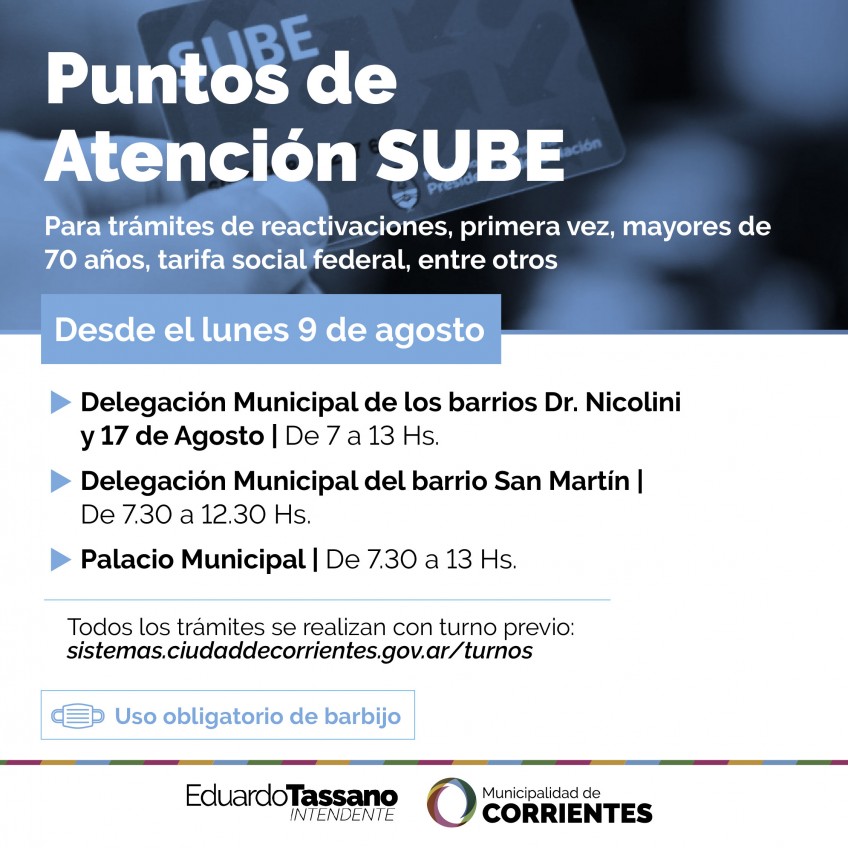 En esos tres espacios, con turno previo que pueden acceder a través de la página https://sistemas.ciudaddecorrientes.gov.ar/turnos/ se podrán realizar todos los trámites relacionados con SUBE como ser: primera vez, reactivaciones, mayores de 70 años, tarifa social federal, entre otros.