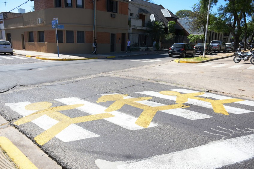 Las figuras infantiles incorporadas en las sendas peatonales fueron pintadas en las señales adyacentes al Jardín de Infantes “Marina Pérez Álvarez” (Santa Fe y San Martín), en la escuela Centenario (por Bolívar, en los cruces con calles Salta y Buenos Aires), y en la escuela Santa Ana (Lavalle y Alberdi).
