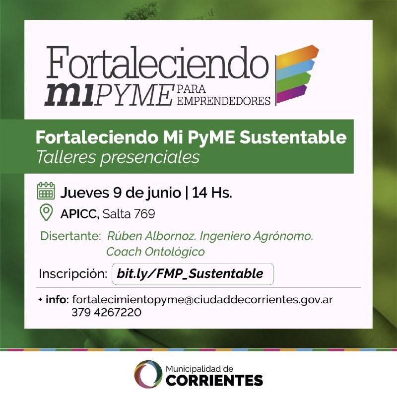 La Municipalidad de la Ciudad de Corrientes informa que se encuentra abierta la inscripción para la segunda jornada del taller presencial denominado “Mi Pyme Sustentable”, dirigida a emprendedores.