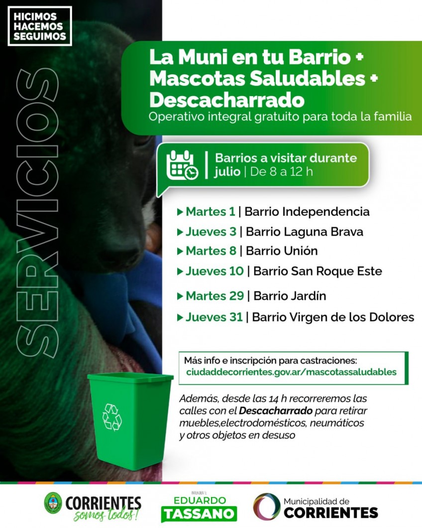 En todos los casos, La Muni en tu Barrio está acompañado del programa Mascotas Saludables, que promueve la tenencia responsable de los animales domésticos, acercando atención veterinaria gratuita, vacunación antirrábica, desparasitaciones, y esterilizaciones (castraciones). Este último servicio debe requerirse con antelación a través del turnero web (https://ciudaddecorrientes.